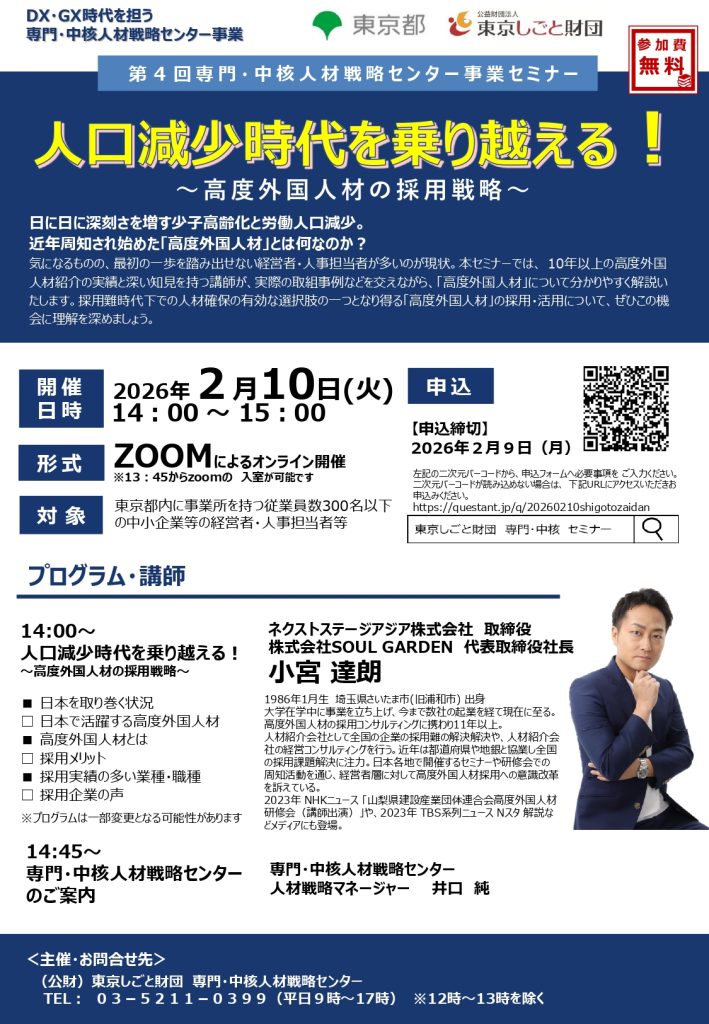 【小宮達朗 セミナー情報】公益財団法人東京しごと財団 専門・中核人材戦略センター主催「人口減少時代を乗り越える!~高度外国人材の採用戦略~」
